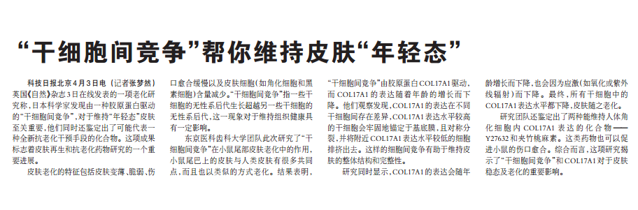 科技日報北京4月3日電(記者張夢然)英國《自然》雜志3日在線發表的一項老化研究稱,日本科學家發現由一種膠原蛋白驅動的“干細胞…