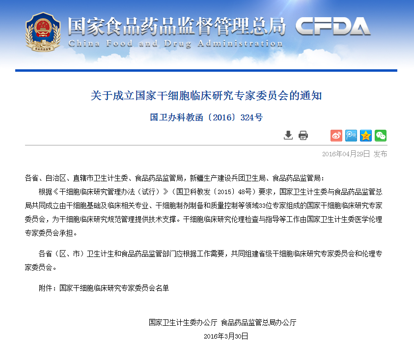 各省、自治區、直轄市衛生計生委、食品藥品監管局,新疆生產建設兵團衛生局、食品藥品監管局: 根據《干細胞臨床研究管理辦法(試行)》(國衛科教發〔2015〕48號)要求,國家衛生計生委與食品藥品監管總局共同成立由干細胞基礎及臨床相關專業、干細胞制劑…