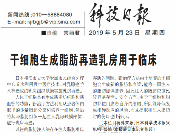日本橫濱市立大學(xué)附屬市民綜合醫(yī)療中心首次利用再生醫(yī)療技術(shù),對乳腺癌手術(shù)等造成的乳房組織缺損實(shí)施乳房再造。人體干細(xì)胞具有生…