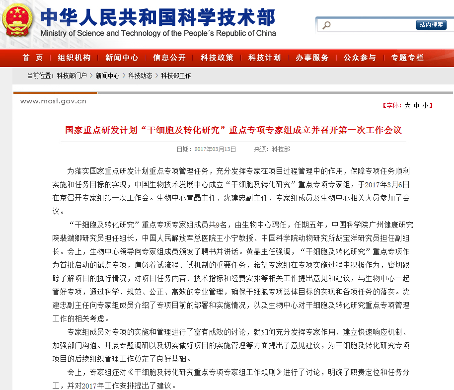 為落實(shí)國家重點(diǎn)研發(fā)計(jì)劃重點(diǎn)專項(xiàng)管理任務(wù),充分發(fā)揮專家在項(xiàng)目過程管理中的作用,保障專項(xiàng)任務(wù)順利實(shí)施和任務(wù)目標(biāo)的實(shí)現(xiàn),中國生物技術(shù)發(fā)展中心成立“干細(xì)胞及轉(zhuǎn)化研究”重點(diǎn)專項(xiàng)專家組,于2017年3月6日在京召開專家組第一次工作會(huì)。生物中心黃晶主任、沈建忠…